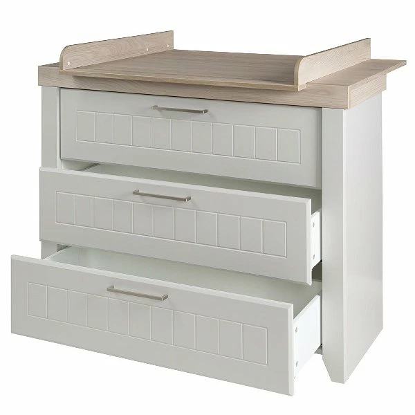 Die Roba Wickelkommode Helene ist mit 3 Schubladen und inklusive Wickelaufsatz, der mittig oben am Wickeltisch befestigt wird, ausgestattet. Die hochwertige Metallgriffe und Fräsungen tragen zum modernen Look bei. Die oberste Schublade verfügt über Vollauszug. Die Schubladen sind mit der Soft Close-Technik für sanftes und leises Schließen versehen. Die breite Wickelkommode bietet viel Platz für alle Wickelutensilien, die griffbereit aufbewahrt werden können.