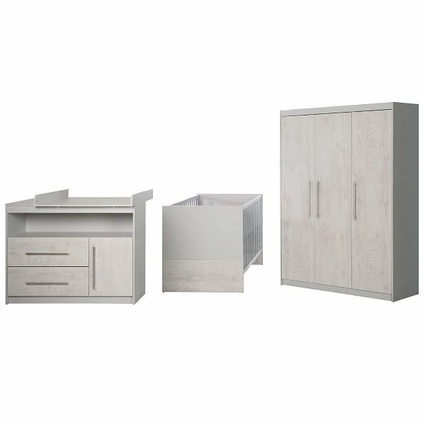 Das roba Kinderzimmer Maren 2 überzeugt mit seiner zeitlosen, 2-farbigen Optik im Dekor weiß gekalkte Eiche mit Echtholzhaptik und in modernem Lichtgrau. Das Kinderbett wächst mit Ihrem Kind mit und kann zum Juniorbett umgewandelt werden. Die breite Wickelkommode bietet viel Platz für alle Wickelutensilien, die griffbereit aufbewahrt werden können. Im dreitürigen Kleiderschrank können Sie die gesamte Kleidung für Ihr Kind unterbringen. Dieser verfügt über eine Kleiderstange und sechs Fachböden.