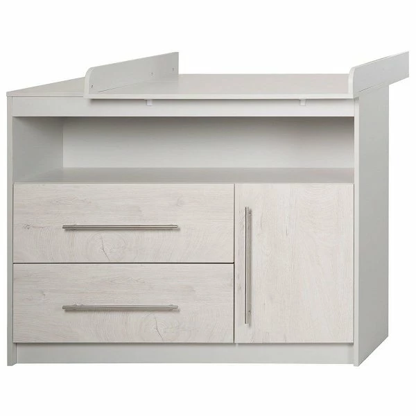 Die schmale Wickelkommode 2 Maren ist mit 2 Schubladen, einer Tür und einem offenen Ablagefach ausgestattet. Sie wird inklusive Wickelansatz, der jederzeit an die Kommode angesetzt und auch abgenommen werden kann, geliefert.