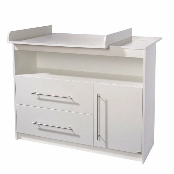 Die schmale Wickelkommode Maren ist mit 2 Schubladen, einer Tür und einem Ablagefach ausgestattet. Sie wird inklusive Wickelansatz, der jederzeit an die Kommode angesetzt und auch abgenommen werden kann, geliefert.