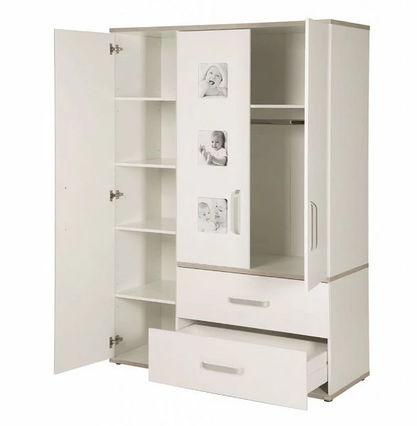 Der Kleiderschrank von Roba ist mit einer großen und zwei kleineren Türen und zwei Schubkästen ausgestattet. Die integrierten Bilderrahmen in der mittleren Tür können mit persönlichen Fotos bestückt werden und machen den Kleiderschrank so zu einem Unikat.