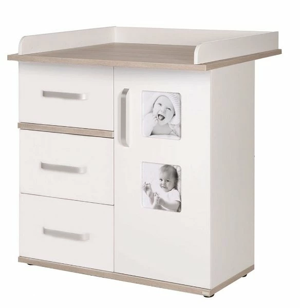 Die Wickelkommode ist mit einem abnehmbaren Wickelansatz ausgestattet. Die 3 Schubladen bieten sehr viel Platz und Stauraum für Windeln und andere Dinge. Der Innenraum hinter der Tür der Kommode ist durch einen Einlegeboden unterteilt. Die integrierten Bilderrahmen können mit persönlichen Fotos bestückt werden und machen die Wickelkommode so zu einem Unikat.