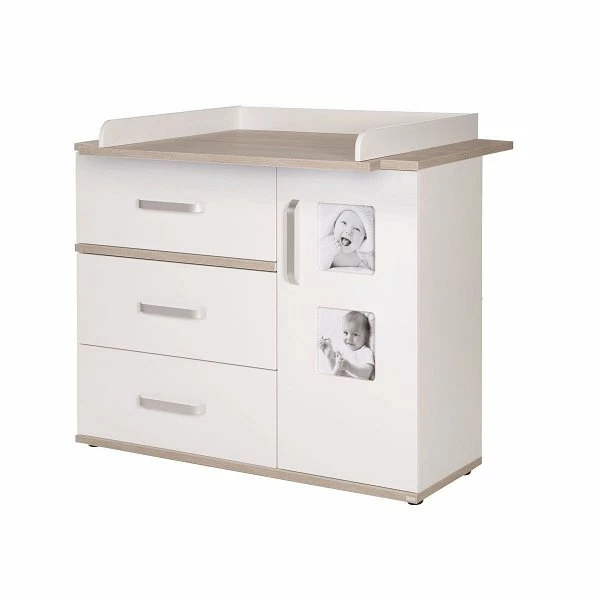 Die Wickelkommode ist mit einem abnehmbaren Wickelansatz ausgestattet. Die 3 Schubladen bieten sehr viel Platz und Stauraum für Windeln und andere Dinge. Der Innenraum hinter der Tür der Kommode ist durch einen Einlegeboden unterteilt. Die integrierten Bilderrahmen können mit persönlichen Fotos bestückt werden und machen die Wickelkommode so zu einem Unikat.
