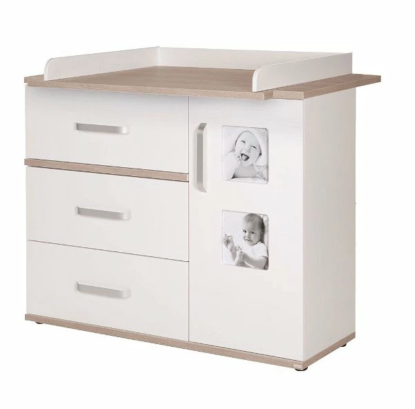 Dekorelemente in ‚Sanremo Eiche‘ sind die Besonderheiten der Roba Pia Wickelkommode. Softclose-Technik für Türen und Schubladen dürfen hier nicht fehlen. Ein besonderer Hingucker sind die integrierten Bilderrahmen – bestückt mit persönlichen Fotos wird jedes Möbelstück zu einem Unikat.
