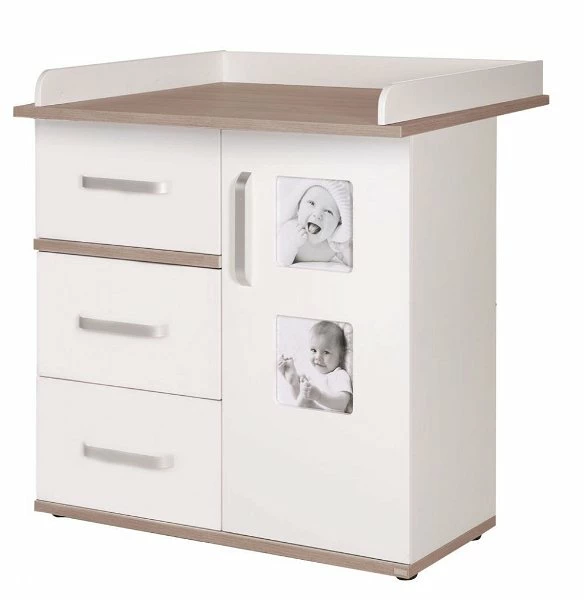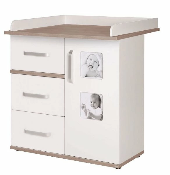 Dekorelemente in ‚Sanremo Eiche‘ sind die Besonderheiten der Roba Pia Wickelkommode. Softclose-Technik für Türen und Schubladen dürfen hier nicht fehlen. Ein besonderer Hingucker sind die integrierten Bilderrahmen – bestückt mit persönlichen Fotos wird jedes Möbelstück zu einem Unikat.