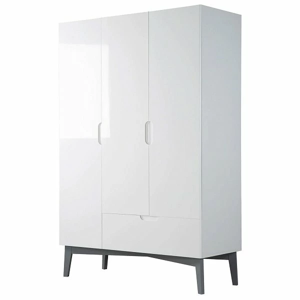 Der Retro 2 Kleiderschrank ist mit 3 Türen und 1 Schubkasten (Softclose) ausgestattet. Innen befindet sich 5 Böden und 1 Kleiderstange.