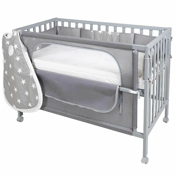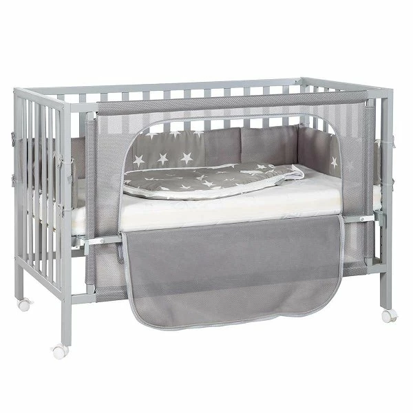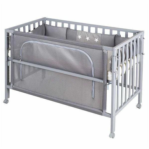 Das Roba Room Bed bietet Eltern und Kind die Möglichkeit, besonders in den ersten Monaten möglichst viel Zeit miteinander zu verbringen. Mit nur wenigen Handgriffen lässt sich das Bett individuell an das Elternbett anpassen. Durch verstellbare Metallwinkel und 6-fache Höhenverstellbarkeit der 60×120 cm großen Liegefläche wird das Roba Room Bed sicher als Beistellbett am Elternbett angebracht. Mittels eines Reißverschluss kann ein Teil der Stoffseite (Canvas) jederzeit schnell und einfach geöffnet werden. Auf diese Weise bietet es insbesondere der Mutter die Nähe zum Kind – ob am Tag oder in der Nacht. Ein Bremsrollensatz sorgt für die nötige Mobilität.
