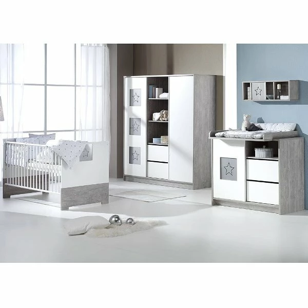 Ein Motiv zum Träumen bietet das Schardt Kinderzimmer Eco Star. Die praktischen Schiebetüren sorgen für eine platzsparende Raumgestaltung. Zusätzliche Regale an Wickelkommode und Kleiderschrank schaffen Ablageflächen für praktische Dinge des Alltags.