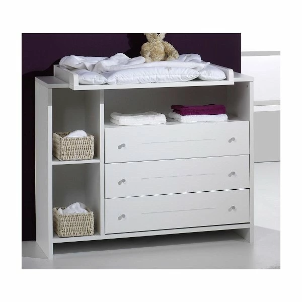 Trendig „natürlich weiß“ präsentiert sich die Wickelkommode ECO Stripe. Die helle Farbauswahl mit dezenter Streifenfräsung der Möbelfronten (MDF) vermitteln Leichtigkeit und ein liebevoll gestaltetes Kinderzimmer. Besonders auffallend und praktisch sind die beiden Seitenregale an der Wickelkommode.