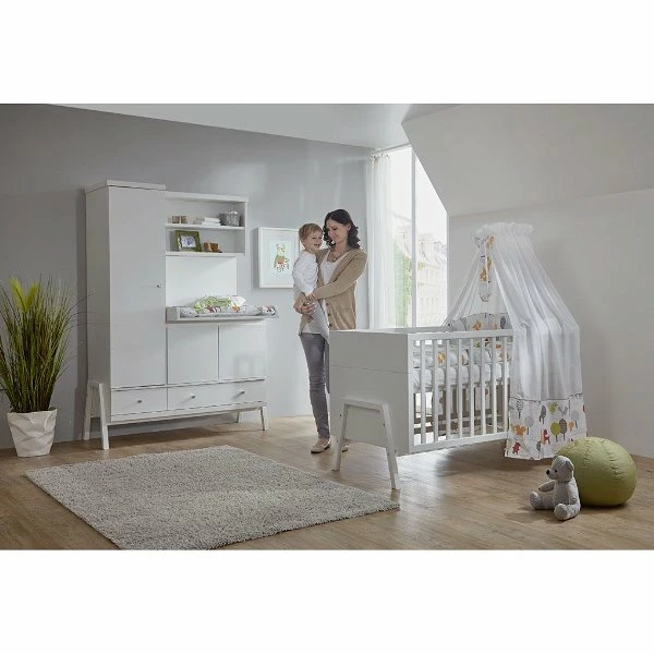 Die platzsparende Kombination aus Kleiderschrank und Wickelkommode ist ein wahres Raumwunder. Die Türen sind mit Soft-Close-System ausgestattet, die Schubkästen besitzen einen Selbsteinzug. Inklusive Umbauset zur Sitzbank.