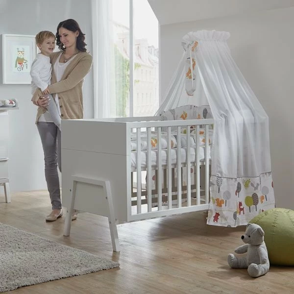 Der Lattenrost und das Gitter des Kombikinderbetts sind aus massiver Buche gefertigt und weiß lackiert. Der Lattenrost ist dreifach höhenverstellbar. Drei Schlupfsprossen erleichtern dem kleinen Bewohner zu gegebener Zeit den Ein- und Ausstieg.