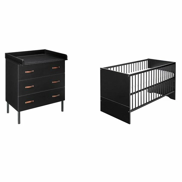 Das Schardt Melody black Sparset ist in schwarz gehalten. Es ist nicht nur chic sondern auch komplett ausgestattet mit Wickelauflage für die Kommode und Umbauseiten, um das Babybett zu gegebener Zeit in ein Juniorbett umzuwandeln.