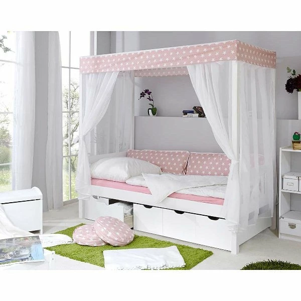 Ticaa Himmelbett Stern Rosa Kiefer Weiß Inkl. 5 Schubkästen & Tüll-Textilien – 90 X 200 Cm