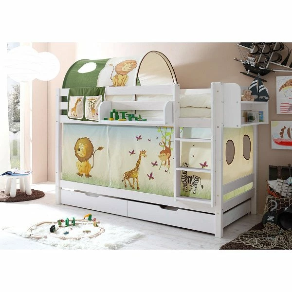 Mit dem Ticaa Marcel Etagenbett gibt es keine Streiterei mehr wer oben oder unten schlafen darf! Das untere Bett schafft dank Vorhang eine „höhlenartige“ Atmosphäre, während das obere mit dem optional erhältlichen Tunnel einen gemütlichen Charakter besitzt. Die massive Bauweise, hohe Pfostenstärke und Fallschutz sorgen für die nötige Sicherheit. Dank vieler praktischer Ergänzungsprodukte kann dieses Bett auf jeden Geschmack ausgerichtet werden.