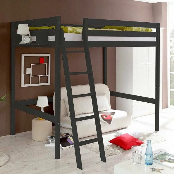 Wunderschönes Hochbett mit Schrägleiter. Der untere Bereich des Ticaa Matthias Hochschläfer Doppelbetts kann als Nische und Stauraum genutzt werden, das hoch gelegene Bett lädt zum Träumen ein.