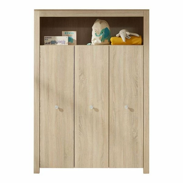Der trendteam Olivia Kleiderschrank ist mit 3 Türen ausgestattet. Links befinden sich 1 Fachboden und 2 Kleiderstangen auf der rechten Seite gibt es 3 Fachböden die aussreichend Platz für die gesamte Babykleidung bietet. Die Verwendung von Melamin sorgt für eine ausgesprochen robuste Oberfläche. Dank des Korpus im Eiche Sägerau hell Dekor wird das Design zum tollen Hingucker und passt sich hervoragend dem Raum an. Vervollständigt wird das Dekor durch silberfarbene Griffe.