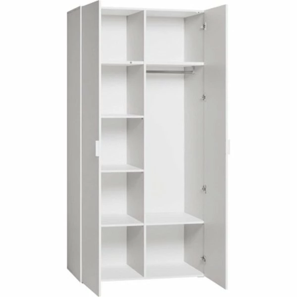 Der Kleiderschrank verfügt über 2 Türen hinter denen sich rechts 2 Böden und 1 Kleiderstange befinden. Auf der linken Seite befinden sich 4 Böden.