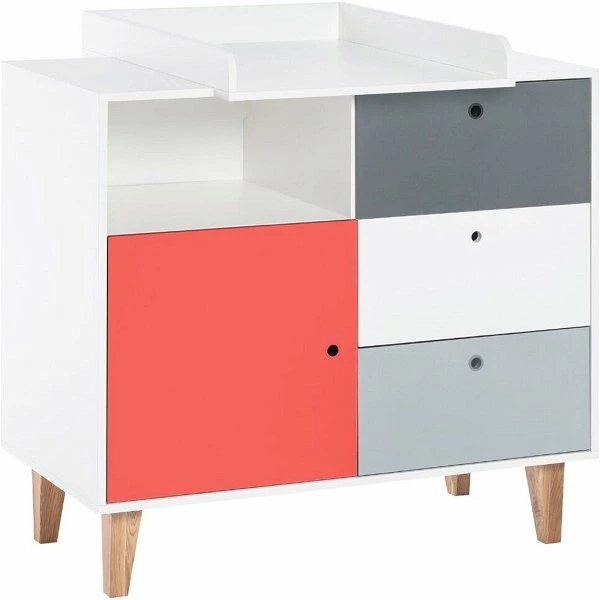 Die Wickelkommode ist mit einem abnehmbaren Wickelaufsatz ausgestattet und mit 4 Schubfächern bietet diese viel Platz für Windeln und Pflegemittel.