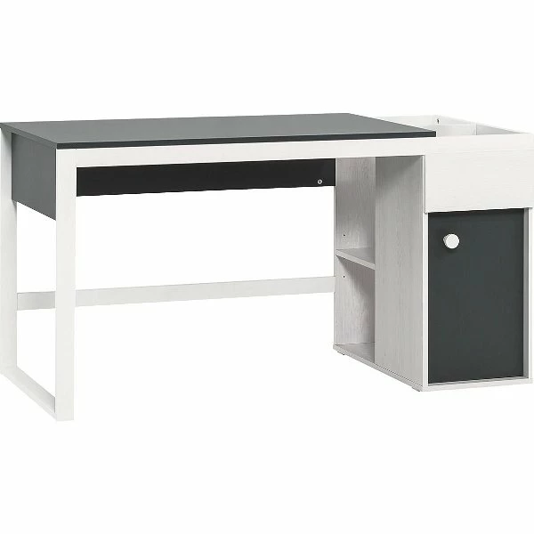 Der VOX Nest Schreibtisch ist elegant, modern und sehr funktional. Rechts im vorderen Teil oben ein Organizer, darunter eine Schublade und unten hinter der Tür ein Schränkchen mit einem regulierbaren Einlegeboden. Rechts im hinteren Teil ein offener Stauraum (z.B. für Papierkorb) und darunter ein offenes Fach (z. B. für Bücher oder Hefte). Schublade ist au hochwertigen Quadro-Gleitschienen montiert, die für müheloses Öffnen und Schließen sorgen. Schublade und Tür sind mit Soft-Close-System ausgestattet. Zum Schreibtisch ist auch eine moderne LED-Beleuchtung erhältlich, die zusätzlich bestellt werden kann.